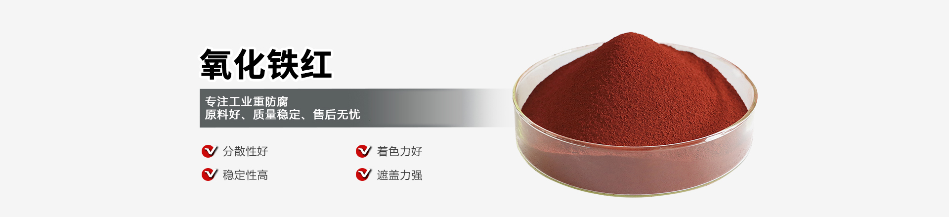 氧化鐵紅又稱鐵氧紅、鐵丹、銹紅,為橙紅至紫紅色的三方晶系粉末。分散性好,在漆膜中具有很好的封閉性和耐候性,著色力和遮蓋力很強。漆膜的穩定性和機械強度高,防銹能力可大幅度提高。耐大氣影響,耐污濁氣體,耐一切堿類,無油滲性和水滲性,不溶于水,無毒、無臭、無異味,環保、安全雙重保障。主要用于建材工業、塑料制品、涂料著色、精磨材料。